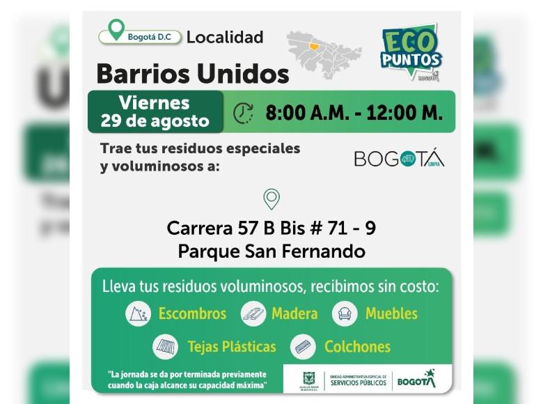 Ten en cuenta que la Unidad Administrativa Especial de Servicios Públicos (UAESP) dispone semanalmente de varios Ecopuntos para prestar este servicio a la ciudadanía en las localidades de Bogotá.