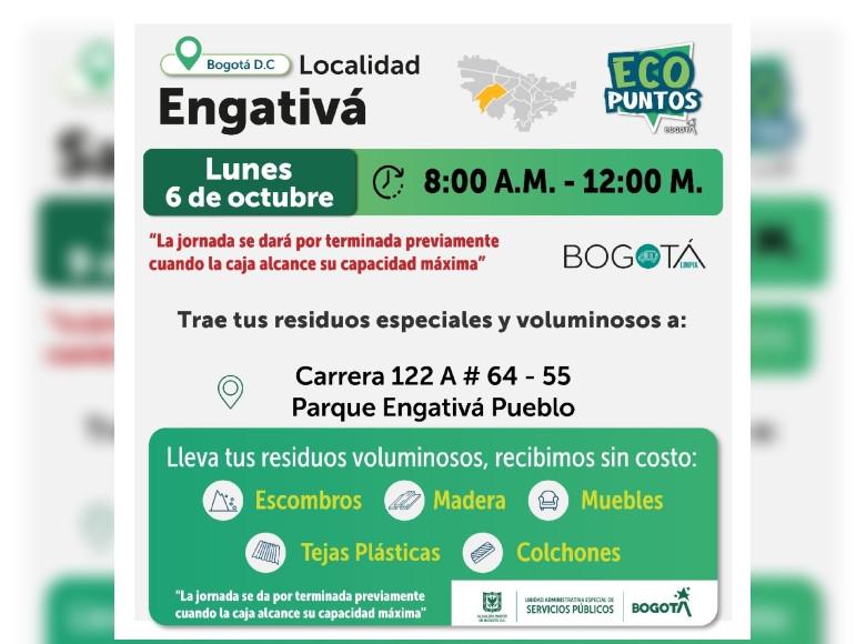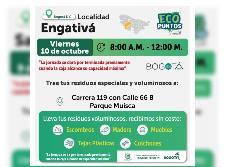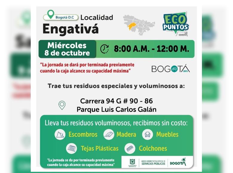 Ten en cuenta que la Unidad Administrativa Especial de Servicios Públicos (UAESP) dispone semanalmente de varios Ecopuntos para prestar este servicio a la ciudadanía en las localidades de Bogotá.