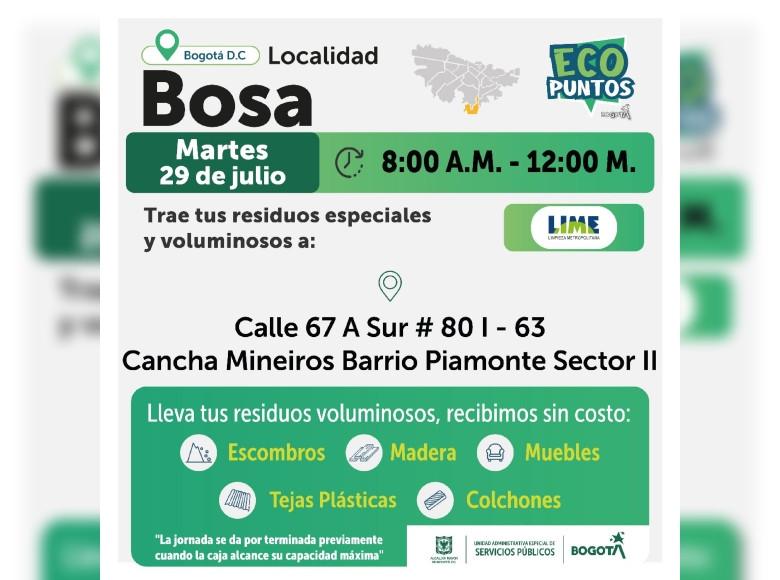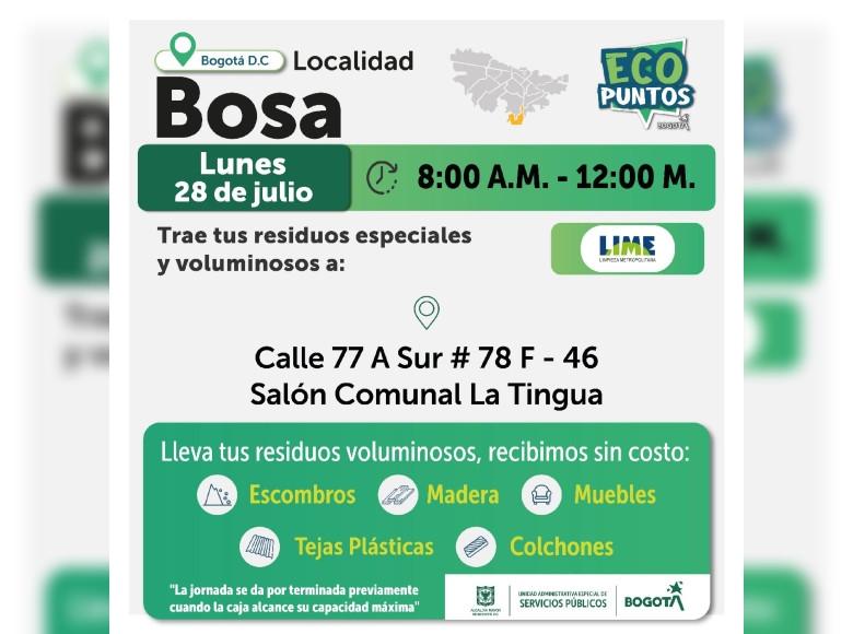 Ten en cuenta que la Unidad Administrativa Especial de Servicios Públicos (UAESP) dispone semanalmente de varios Ecopuntos para prestar este servicio a la ciudadanía en las localidades de Bogotá.