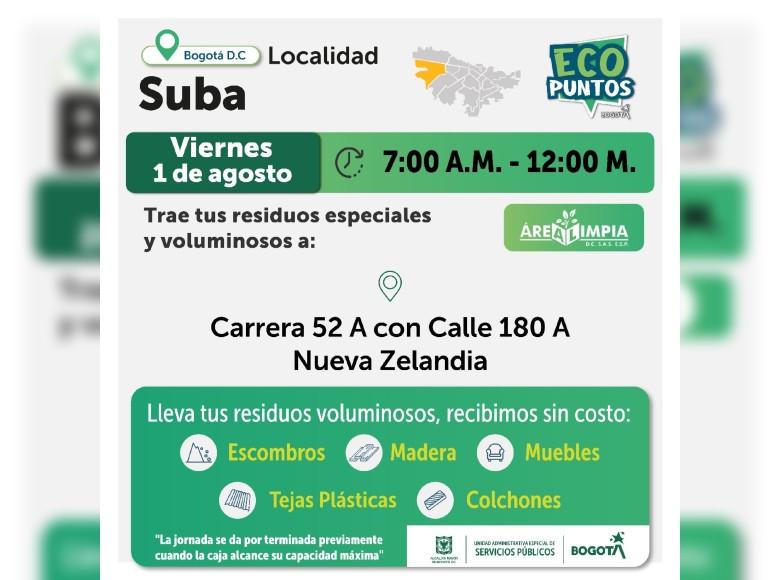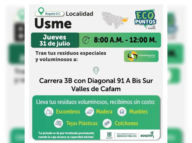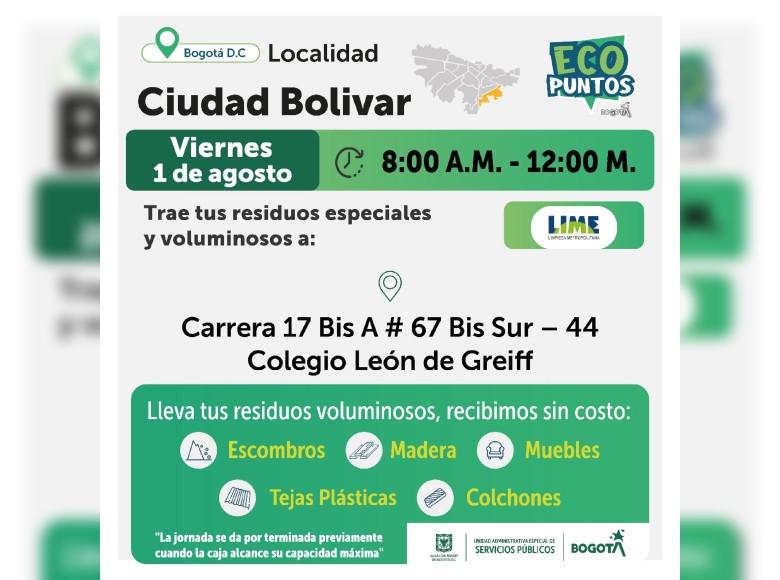 ¡Aquí sí pasa, en Bogotá, mi Ciudad, mi Casa trabajamos para mantener limpia nuestra ciudad! La Unidad Administrativa Especial de Servicios Públicos (UAESP), invita a la ciudadanía que tenga muebles, escombros o enseres en mal estado a llevarlos a los Ecopuntos disponibles en Bogotá que se tendrán ubicados en Suba, Usme y más localidades, del 28 de julio al 3 de agosto de 2025.