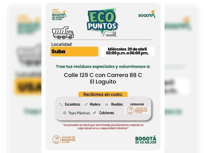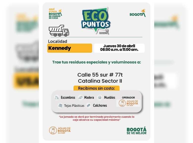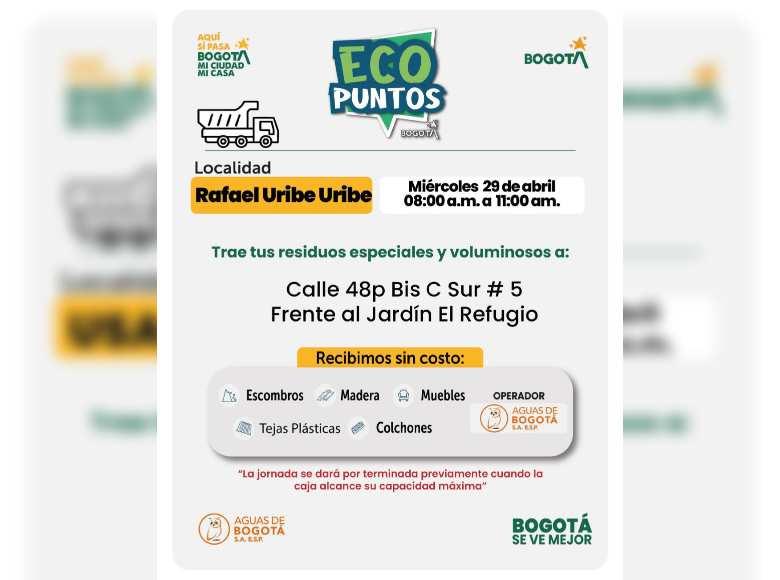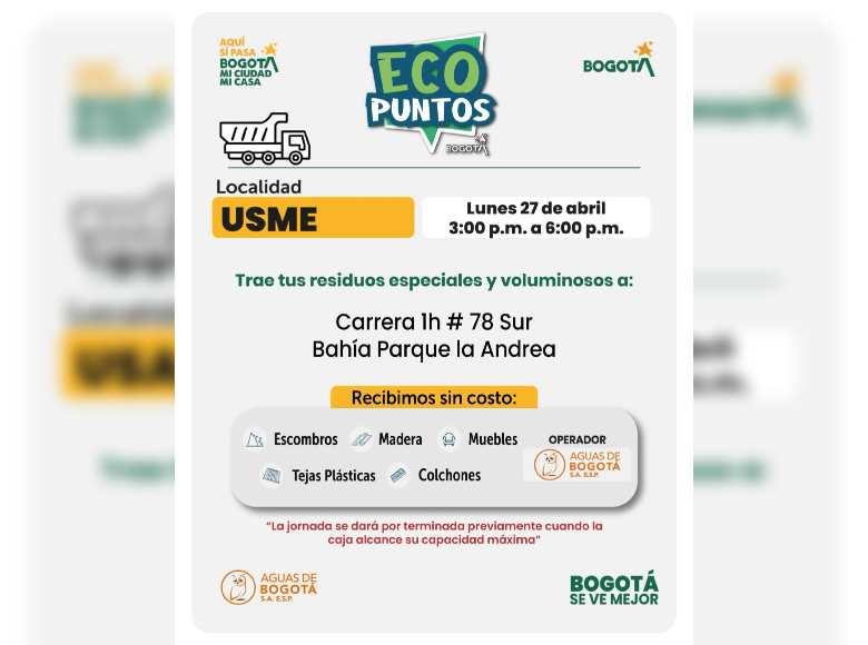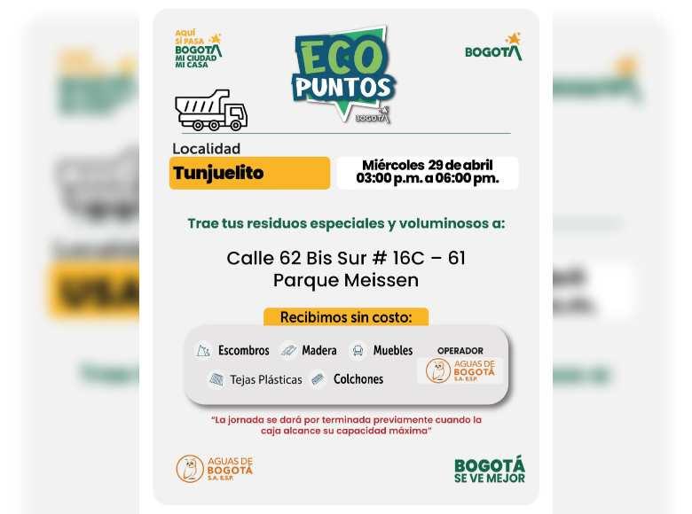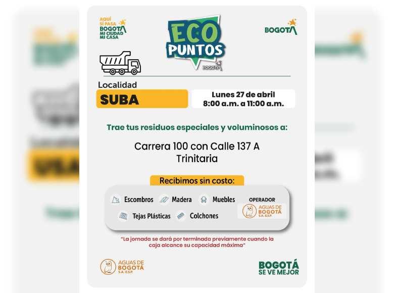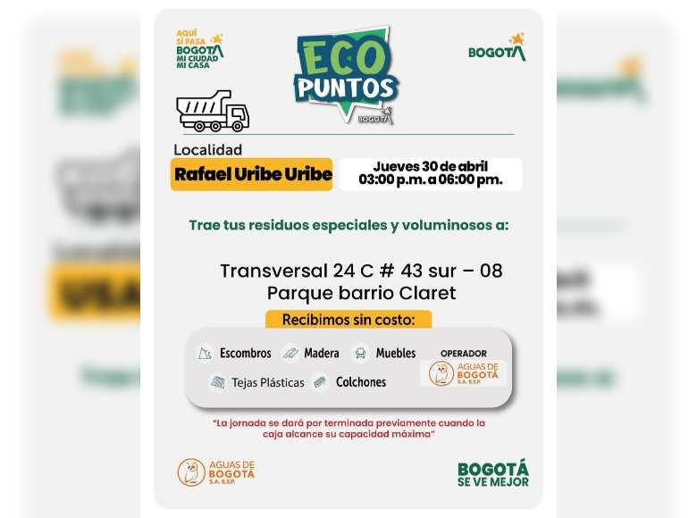¡Aquí sí pasa, en Bogotá, mi Ciudad, mi Casa trabajamos para mantener limpia nuestra ciudad! La Unidad Administrativa Especial de Servicios Públicos (UAESP) invita a la ciudadanía que tenga muebles, escombros o enseres en mal estado a llevarlos a los Ecopuntos disponibles en Bogotá que se tendrán ubicados en diversas localidades, del 27 al 30 de abril del 2026.