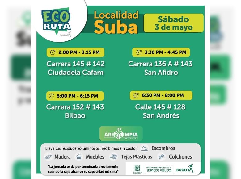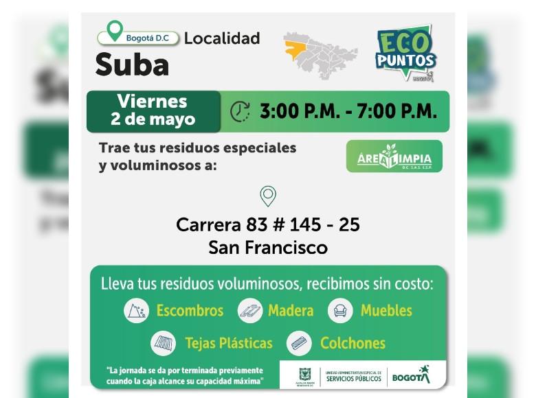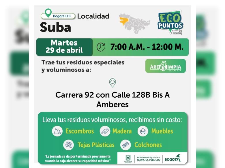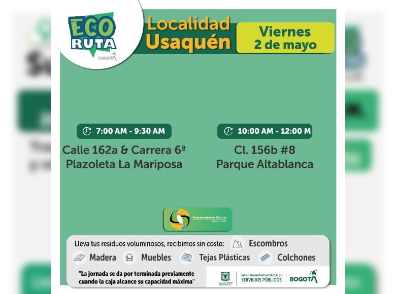 Ten en cuenta que la UAESP dispone semanalmente de varios Ecopuntos para prestar este servicio a la ciudadanía en las localidades de Bogotá.
