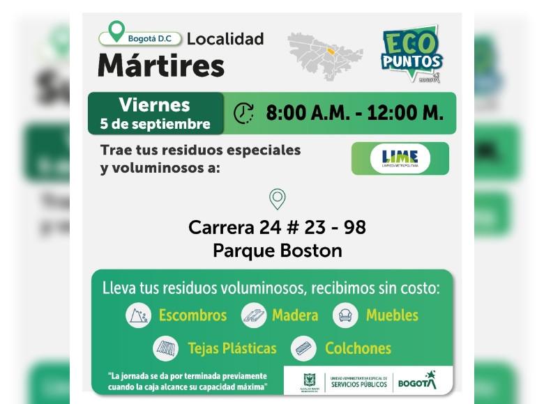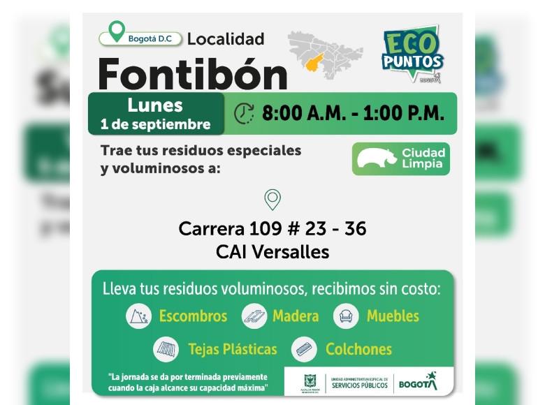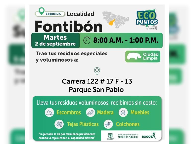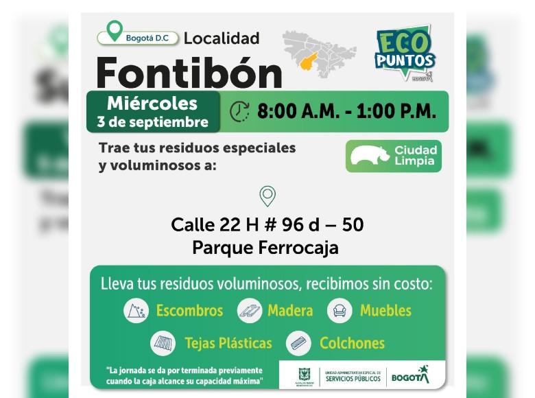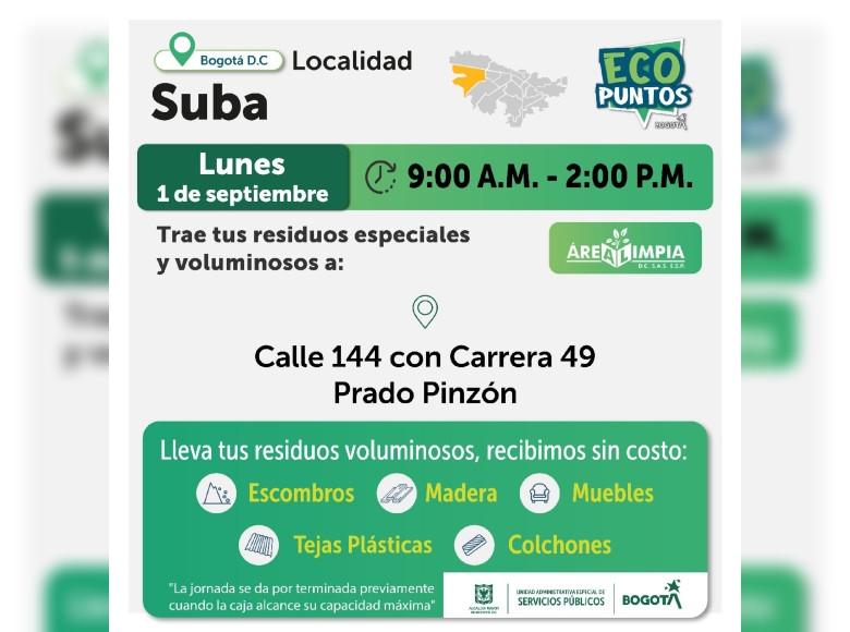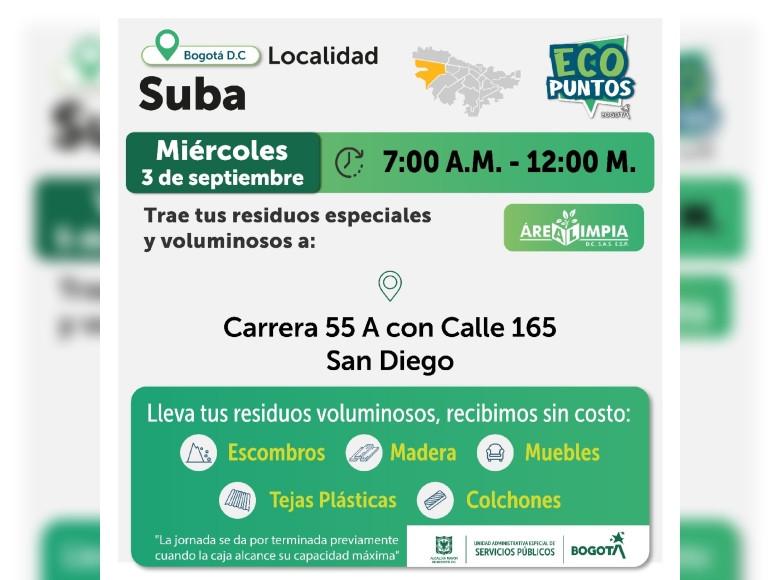 La Unidad Administrativa Especial de Servicios Públicos (UAESP), invita a la ciudadanía que tenga escombros, muebles o enseres en mal estado a llevarlos a los Ecopuntos disponibles en Bogotá que se tendrán ubicados en Suba y más localidades, del 1 al 7 de septiembre de 2025.