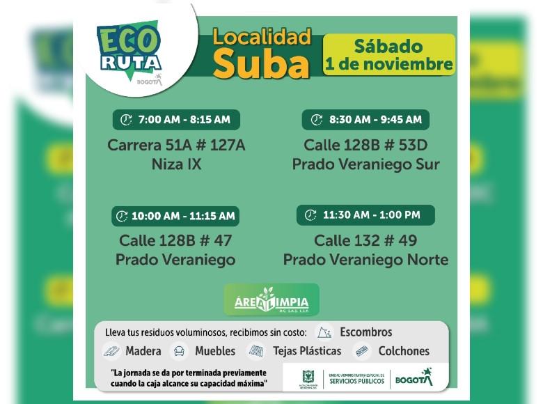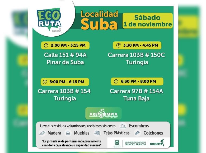 La Unidad Administrativa Especial de Servicios Públicos (UAESP) invita a la ciudadanía que tenga escombros o muebles en mal estado a llevarlos a los puntos disponibles que se tendrán con la Ecoruta el sábado 1 de noviembre de 2025, en la localidad de Suba en Bogotá.
