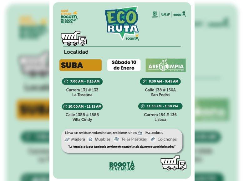 La Unidad Administrativa Especial de Servicios Públicos (UAESP) invita a la ciudadanía que tenga escombros o muebles en mal estado a llevarlos a los puntos disponibles que se tendrán con la Ecoruta el sábado 10 de enero de 2026, en la localidad de Suba en Bogotá.