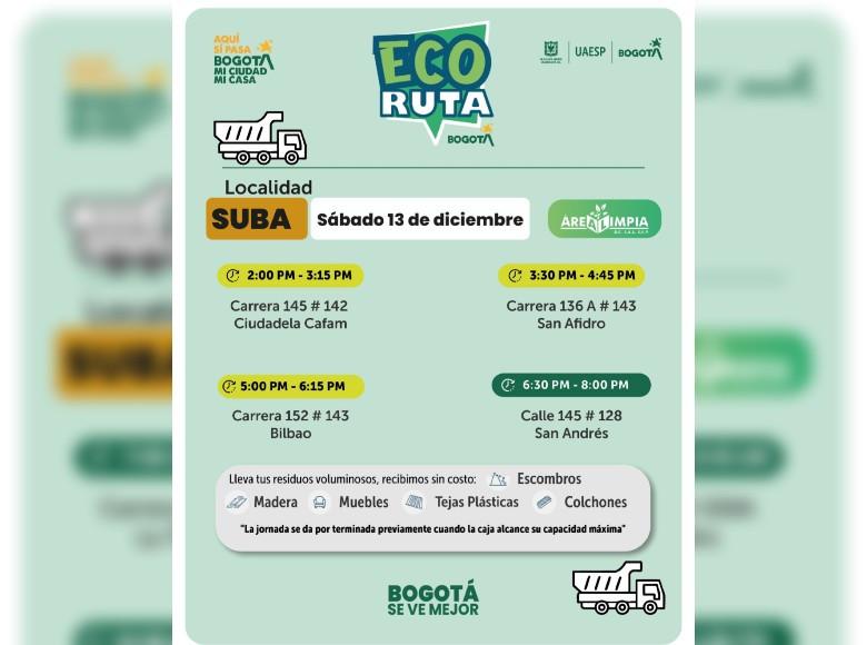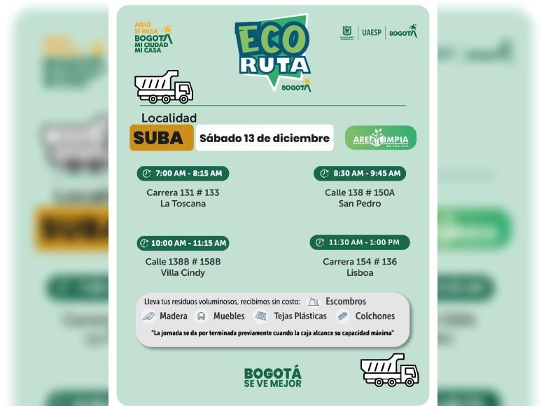 La Unidad Administrativa Especial de Servicios Públicos (UAESP) invita a la ciudadanía que tenga escombros o muebles en mal estado a llevarlos a los puntos disponibles que se tendrán con la Ecoruta el sábado 13 de diciembre de 2025, en la localidad de Suba en Bogotá.