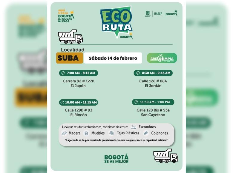 La Unidad Administrativa Especial de Servicios Públicos (UAESP) invita a la ciudadanía que tenga escombros o muebles en mal estado a llevarlos a los puntos disponibles que se tendrán con la Ecoruta el sábado 14 de febrero del 2026, en la localidad de Suba en Bogotá.