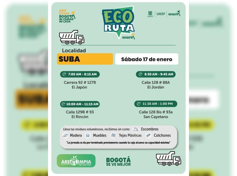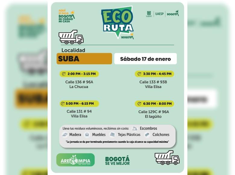 La Unidad Administrativa Especial de Servicios Públicos (UAESP) invita a la ciudadanía que tenga escombros o muebles en mal estado a llevarlos a los puntos disponibles que se tendrán con la Ecoruta este sábado 17 de enero, en la localidad de Suba en Bogotá.