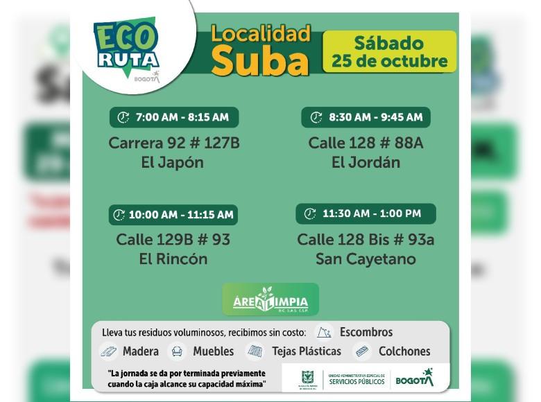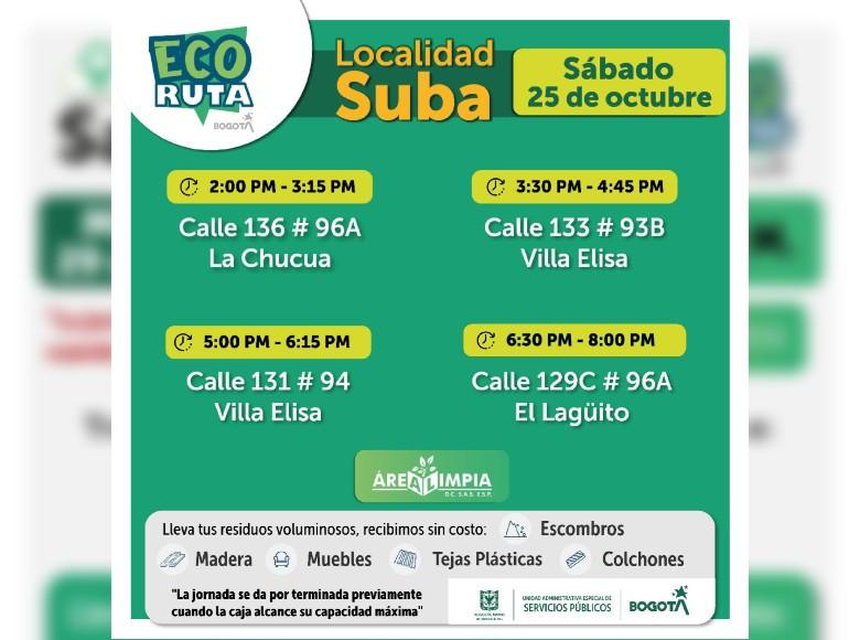 La Unidad Administrativa Especial de Servicios Públicos (UAESP) invita a la ciudadanía que tenga escombros o muebles en mal estado a llevarlos a los puntos disponibles que se tendrán con la Ecoruta el sábado 25 de octubre de 2025, en la localidad de Suba en Bogotá.