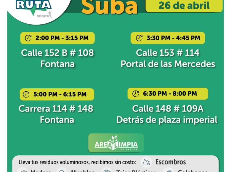 La Unidad Administrativa Especial de Servicios Públicos (UAESP), invita a la ciudadanía que tenga escombros o muebles en mal estado a llevarlos a los puntos disponibles que se tendrán con la Ecoruta el sábado 26 de abril de 2025, en la localidad de Suba en Bogotá.