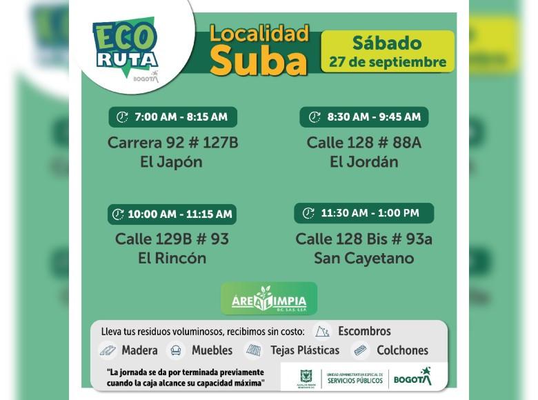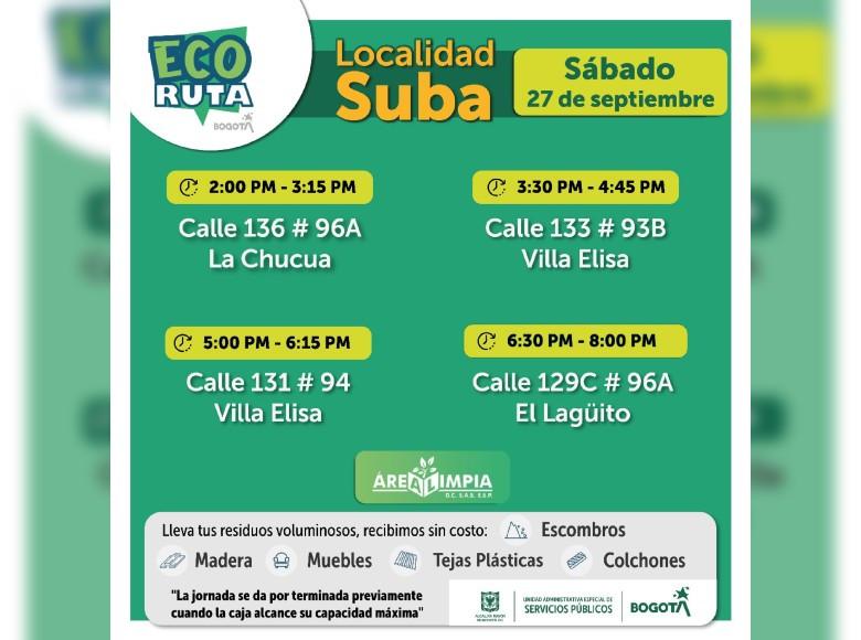 La Unidad Administrativa Especial de Servicios Públicos (UAESP) invita a la ciudadanía que tenga escombros o muebles en mal estado a llevarlos a los puntos disponibles que se tendrán con la Ecoruta el sábado 27 de septiembre de 2025, en la localidad de Suba en Bogotá.