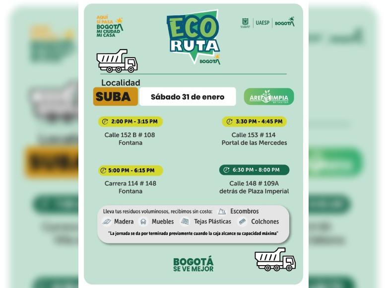 La Unidad Administrativa Especial de Servicios Públicos (UAESP) invita a la ciudadanía que tenga escombros o muebles en mal estado a llevarlos a los puntos disponibles que se tendrán con la Ecoruta el sábado 31 de enero del 2026, en la localidad de Suba en Bogotá.