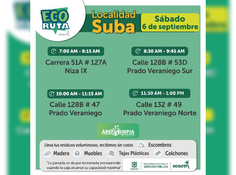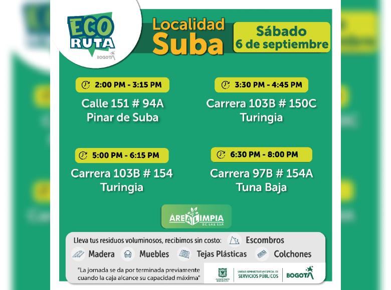 La Unidad Administrativa Especial de Servicios Públicos (UAESP) invita a la ciudadanía que tenga escombros o muebles en mal estado a llevarlos a los puntos disponibles que se tendrán con la Ecoruta este sábado 6 de septiembre, en la localidad de Suba en Bogotá.