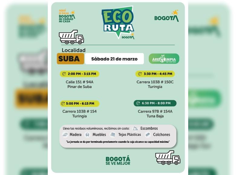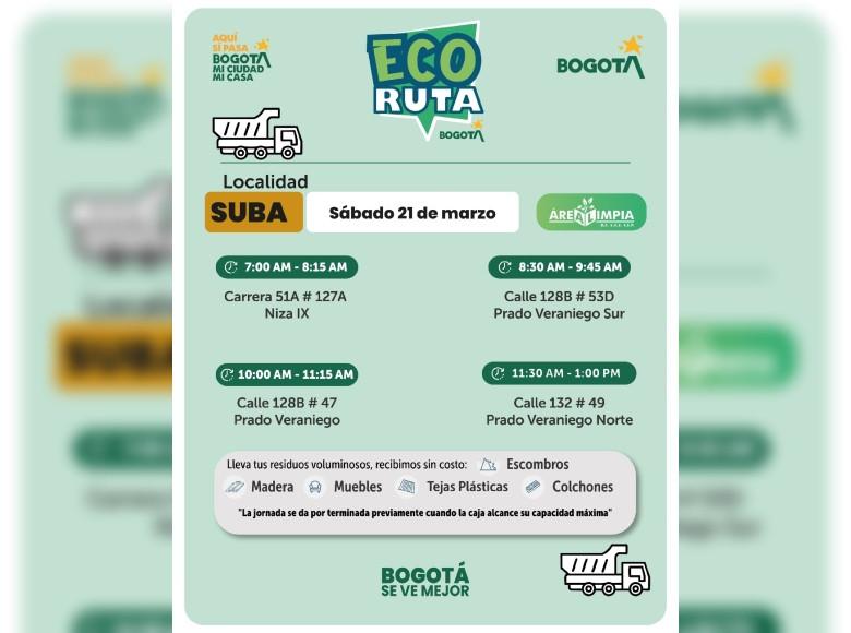 La Unidad Administrativa Especial de Servicios Públicos (UAESP), invita a la ciudadanía que tenga escombros o muebles en mal estado a llevarlos a los puntos disponibles que se tendrán con la Ecoruta el sábado 21 de marzo del 2026, en la localidad de Suba en Bogotá, mi Ciudad, mi Casa.