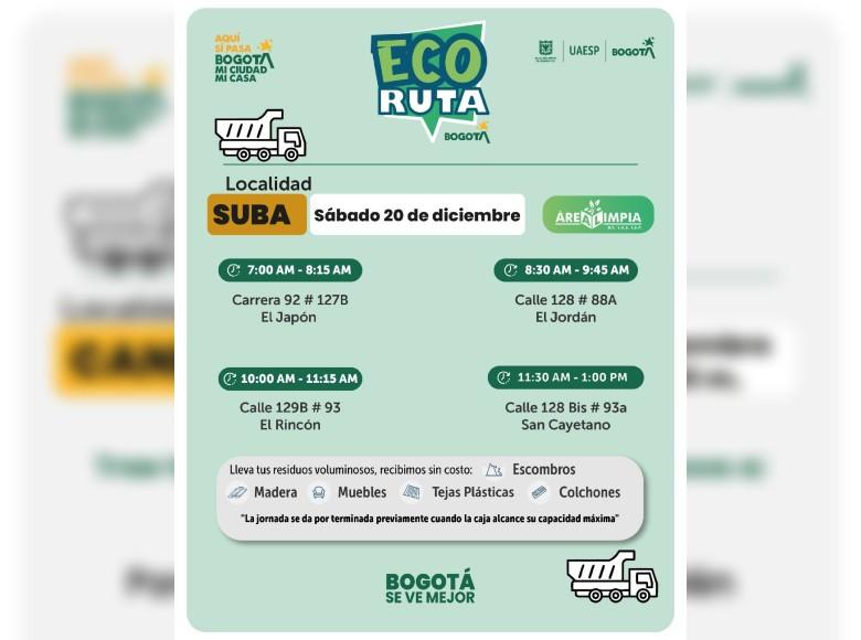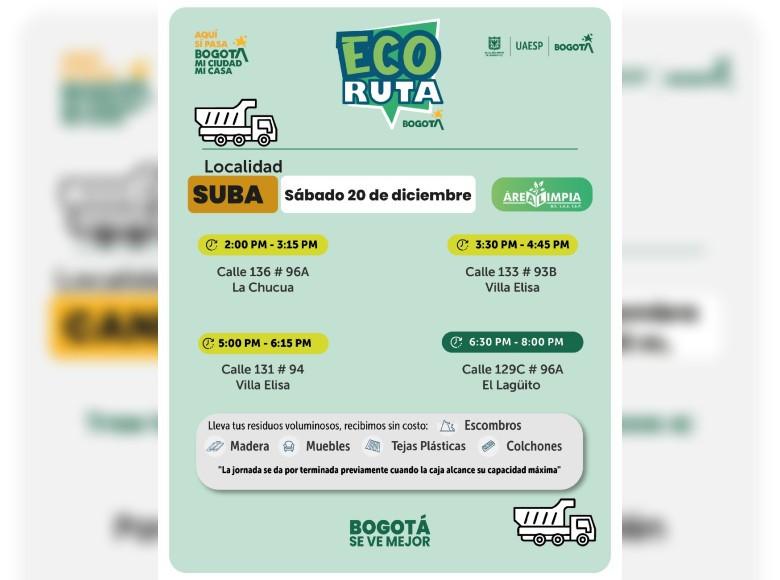 La Unidad Administrativa Especial de Servicios Públicos (UAESP) invita a la ciudadanía que tenga escombros o muebles en mal estado a llevarlos a los puntos disponibles que se tendrán con la Ecoruta el sábado 20 de diciembre de 2025, en la localidad de Suba en Bogotá, mi Ciudad, mi Casa.