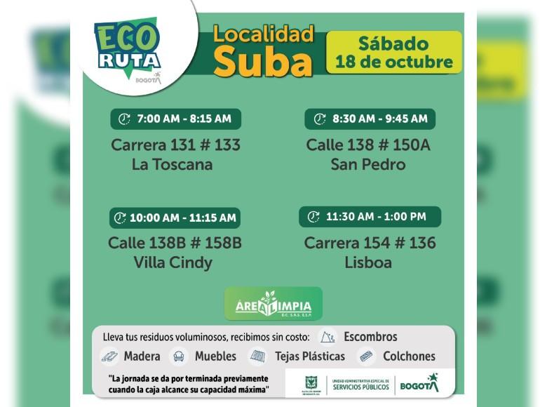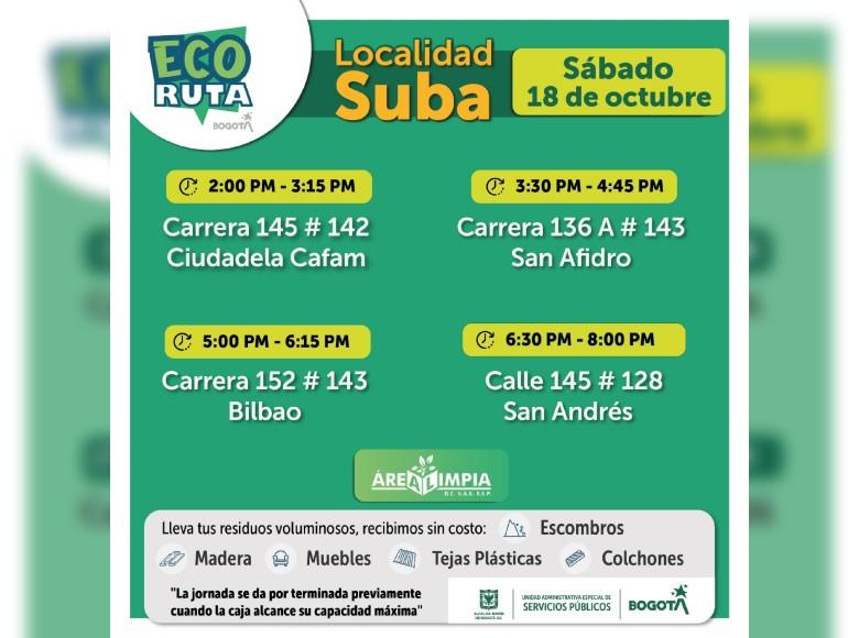La Unidad Administrativa Especial de Servicios Públicos (UAESP) invita a la ciudadanía que tenga escombros o muebles en mal estado a llevarlos a los puntos disponibles que se tendrán con la Ecoruta el sábado 18 de octubre de 2025, en la localidad de Suba en Bogotá, mi Ciudad, mi Casa.