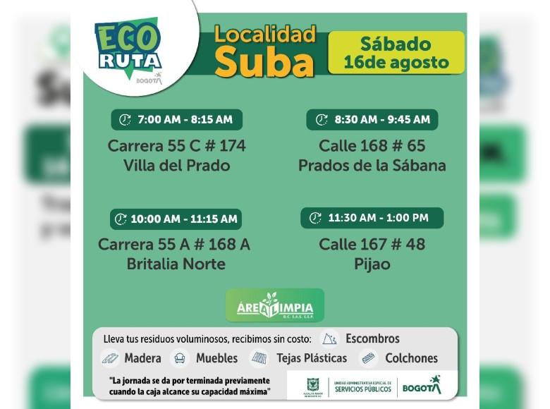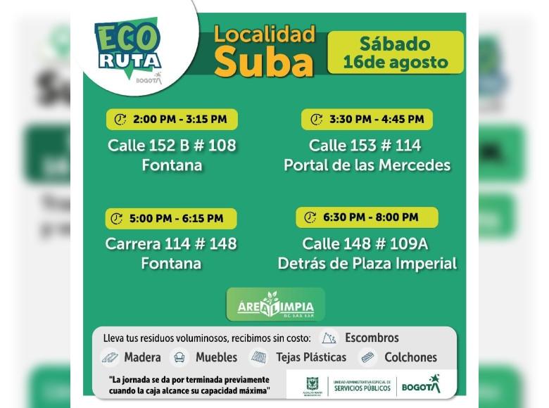 ¡Aquí sí pasa, en Bogotá, mi Ciudad, mi Casa trabajamos para mantener limpia nuestra ciudad! La Unidad Administrativa Especial de Servicios Públicos (UAESP), invita a la ciudadanía que tenga escombros, muebles o enseres en mal estado a llevarlos a la Ecoruta disponible en Bogotá que se tendrá ubicada en la localidad de Suba, este sábado 16 de agosto de 2025.