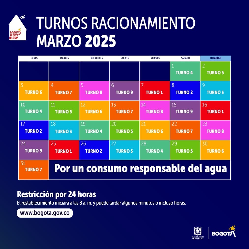 Por este motivo, la Alcaldía Mayor de Bogotá y la Empresa de Acueducto y Alcantarillado de Bogotá (EAAB) dan a conocer las nueve zonas y turnos de racionamiento de agua que tienen cortes en el suministro de agua por un lapso de 24 horas continuas de 8:00 a. m. a 8:00 a. m. del día siguiente.