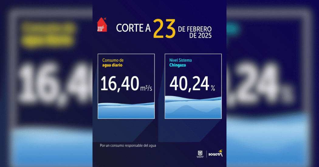 El consumo de agua en Bogotá durante el 23 de febrero fue de 16,40 m³/s. El nivel de los embalses del Sistema Chingaza se encuentra en 40,24 %. #CierraLaLlaveYapic.twitter.com/op3Dl2aMhH