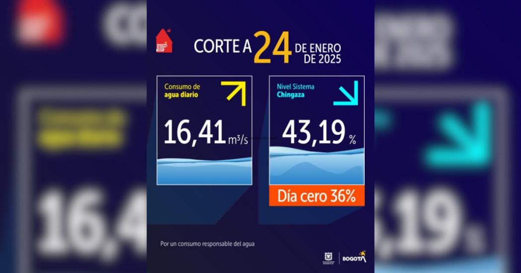 ¡En 'Bogotá, mi Ciudad, mi Casa' seguimos con medidas de ahorro y cuidado del agua! Según la Empresa de Acueducto y Alcantarillado de Bogotá (EAAB), este viernes 24 de enero de 2025, se presentó en Bogotá y municipios aledaños un consumo de agua de 16,41 metros cúbicos por segundo. El nivel de los embalses del Sistema Chingaza, con corte al 24 de enero de 2025 se encuentra en 43.19 %. Chingaza bajó 670.000 metros cúbicos.