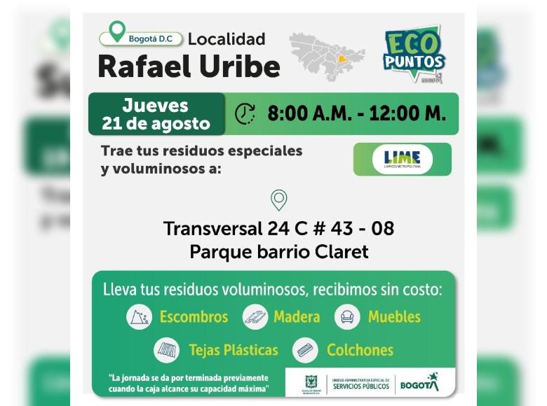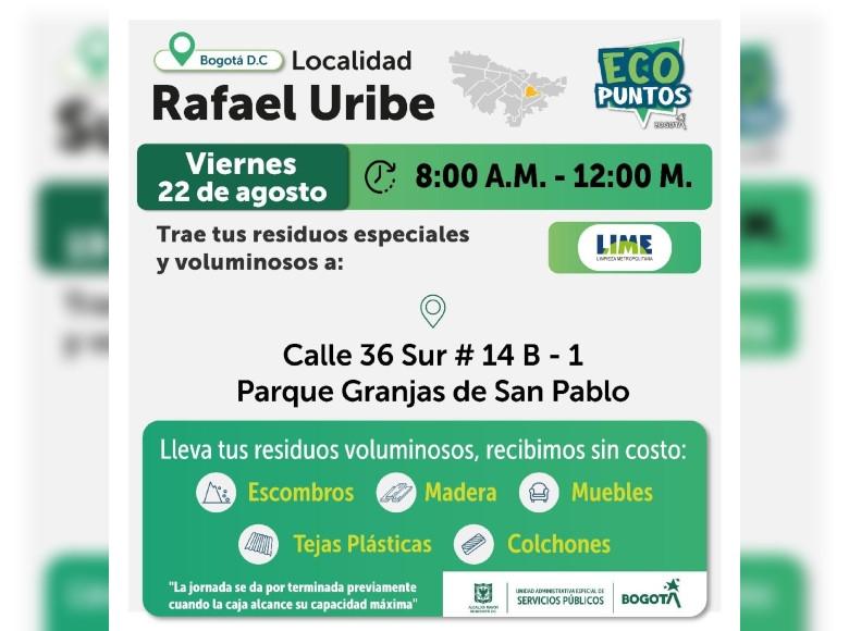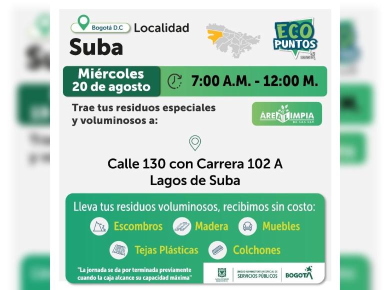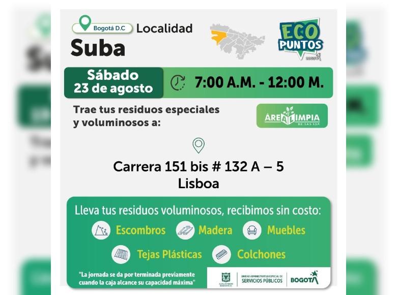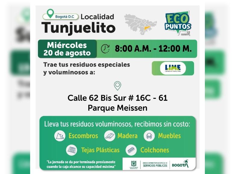 ¡Aquí sí pasa, en Bogotá, mi Ciudad, mi Casa trabajamos para mantener limpia nuestra ciudad! La Unidad Administrativa Especial de Servicios Públicos (UAESP) invita a la ciudadanía que tenga muebles, escombros o enseres en mal estado a llevarlos a los Ecopuntos disponibles en Bogotá que se tendrán ubicados en Suba, Tunjuelito y más localidades, del 19 al 24 de agosto 2025.