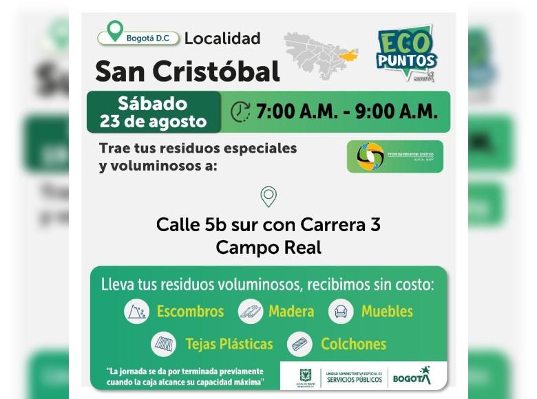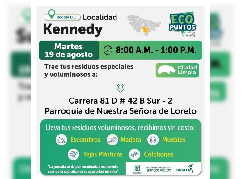 Ten en cuenta que la Unidad Administrativa Especial de Servicios Públicos (UAESP) dispone semanalmente de varios Ecopuntos para prestar este servicio a la ciudadanía en las localidades de Bogotá.
