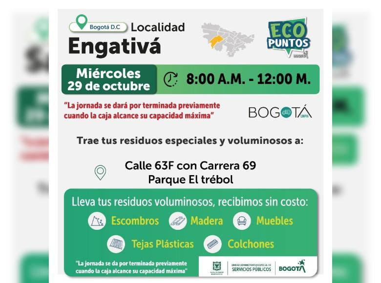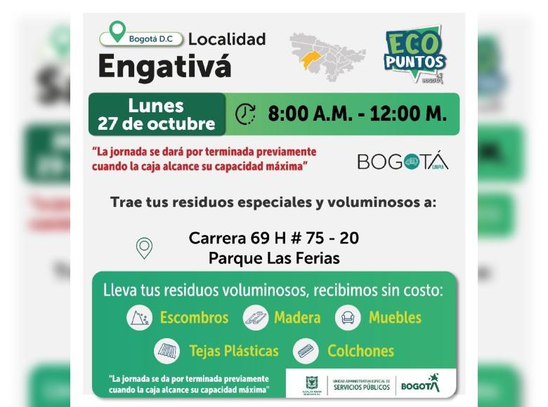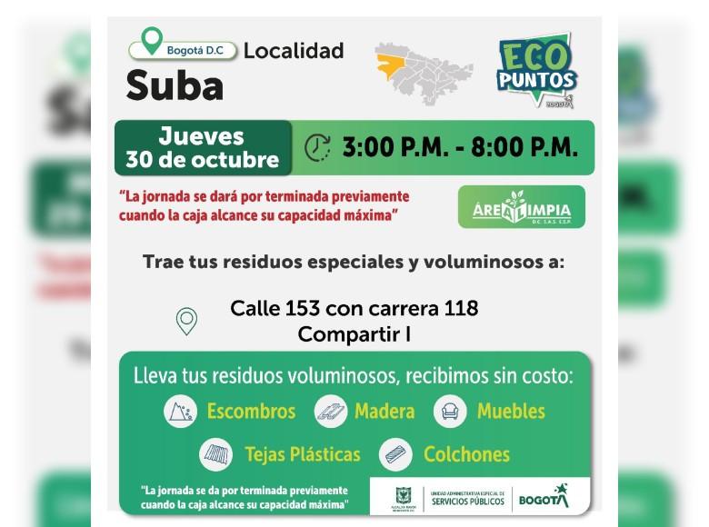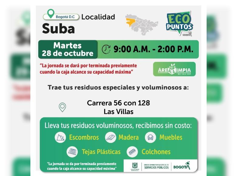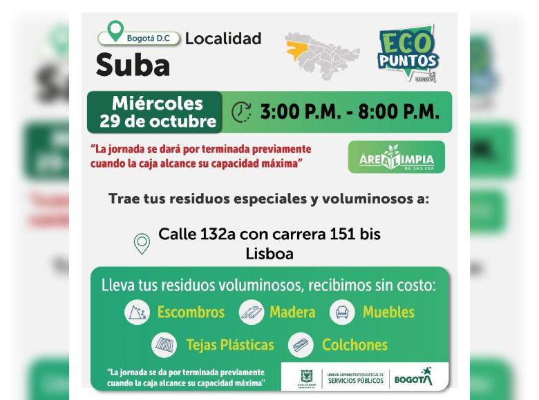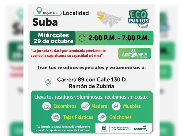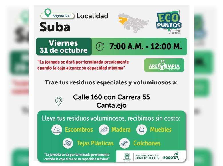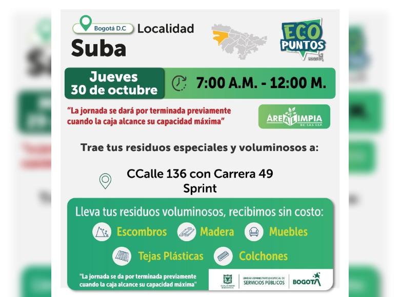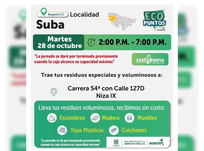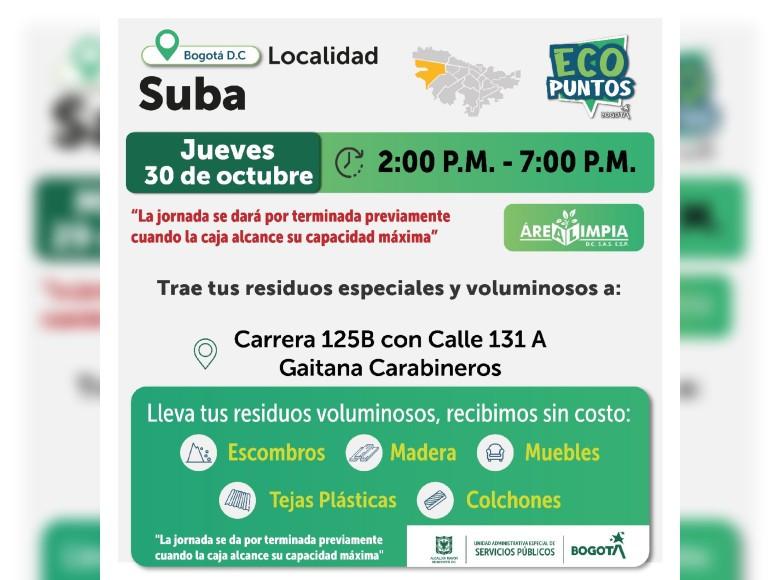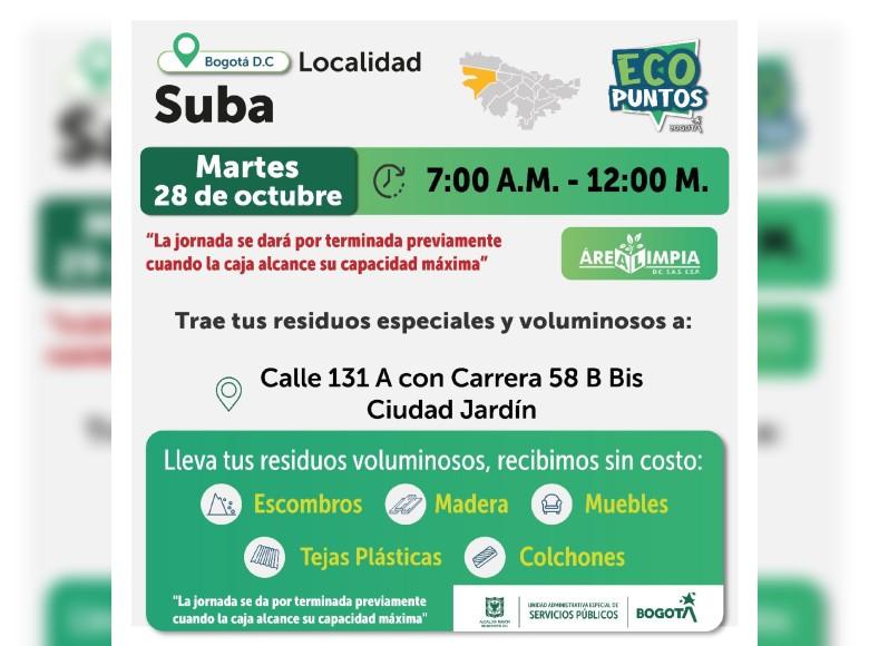 ¡Aquí sí pasa, en Bogotá, mi Ciudad, mi Casa trabajamos para mantener limpia nuestra ciudad! La Unidad Administrativa Especial de Servicios Públicos (UAESP) invita a la ciudadanía que tenga muebles, escombros o enseres en mal estado a llevarlos a los Ecopuntos disponibles en Bogotá que se tendrán ubicados en Suba, Engativá y más localidades, del 27 al 31 de octubre de 2025.