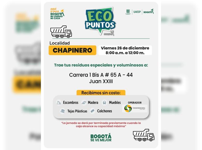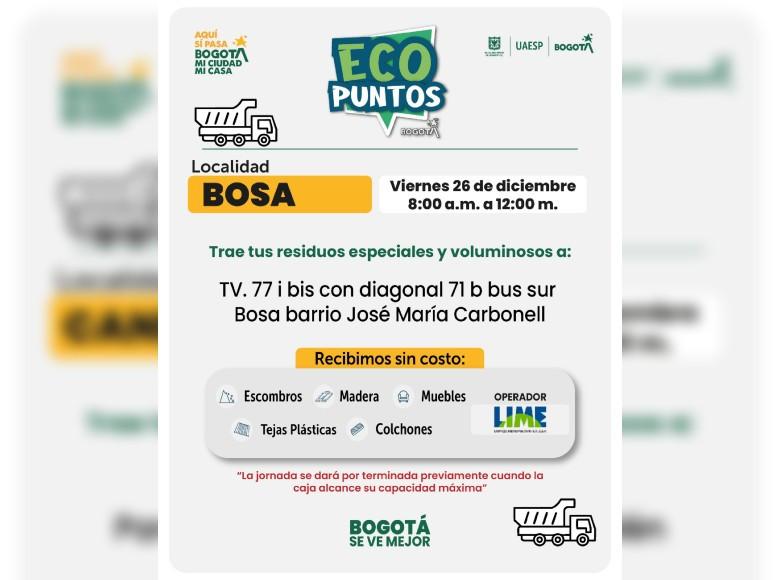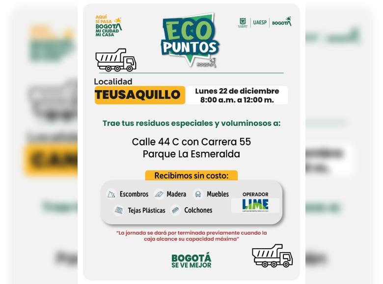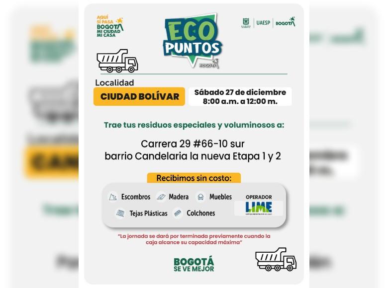 ¡Aquí sí pasa, en Bogotá, mi Ciudad, mi Casa trabajamos para mantener limpia nuestra ciudad! La Unidad Administrativa Especial de Servicios Públicos (UAESP) invita a la ciudadanía que tenga muebles, escombros o enseres en mal estado a llevarlos a los Ecopuntos disponibles en Bogotá que se tendrán ubicados en Suba, Engativá y más localidades, del 22 al 27 de diciembre de 2025.