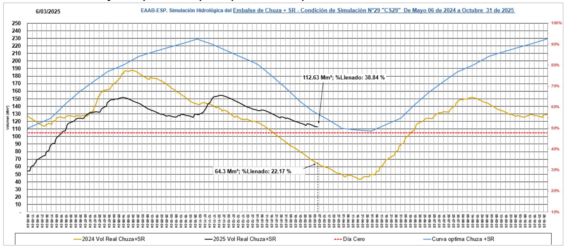 La estrategia técnica de la EAAB permite que el sistema Chingaza esté en un 38,84 % de su capacidad, un porcentaje de llenado aceptable teniendo en cuenta la época del año que tradicionalmente se caracteriza por ser temporada seca y la cual termina en marzo dando comienzo al periodo de lluvias en el mes de abril.