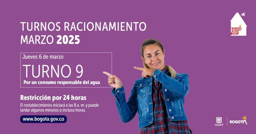 La Alcaldía Mayor de Bogotá recuerda que la restricción o racionamiento del servicio de agua potable en cada turno inicia a las 8:00 a. m. y durará 24 horas.