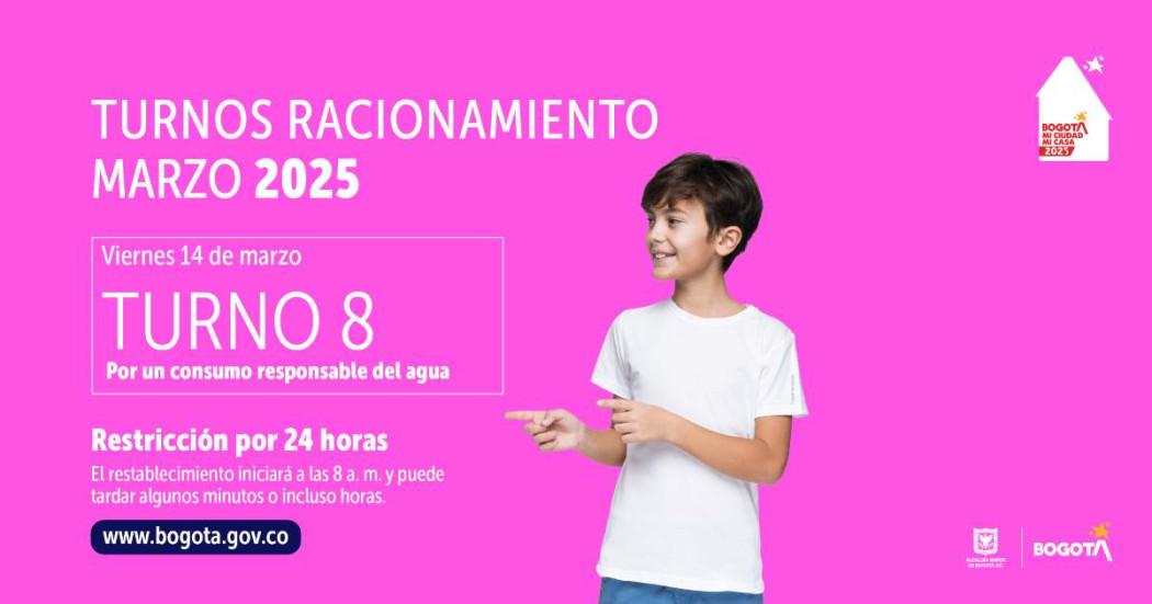 Hoy viernes 14 de marzo de 2025, rige el turno ocho de racionamiento de agua en Bogotá y en el municipio de La Calera. Este turno del ciclo 31, aplica en en barrios de las localidades de Antonio Nariño, Bosa, La Candelaria, Chapinero, Kennedy, Los Mártires, Rafael Uribe Uribe, San Cristóbal, Santa Fe, Usaquén y en los puntos de suministro del vecino municipio de La Calera y Arboretto, en Cundinamarca. ¡Agéndate y prográmate!