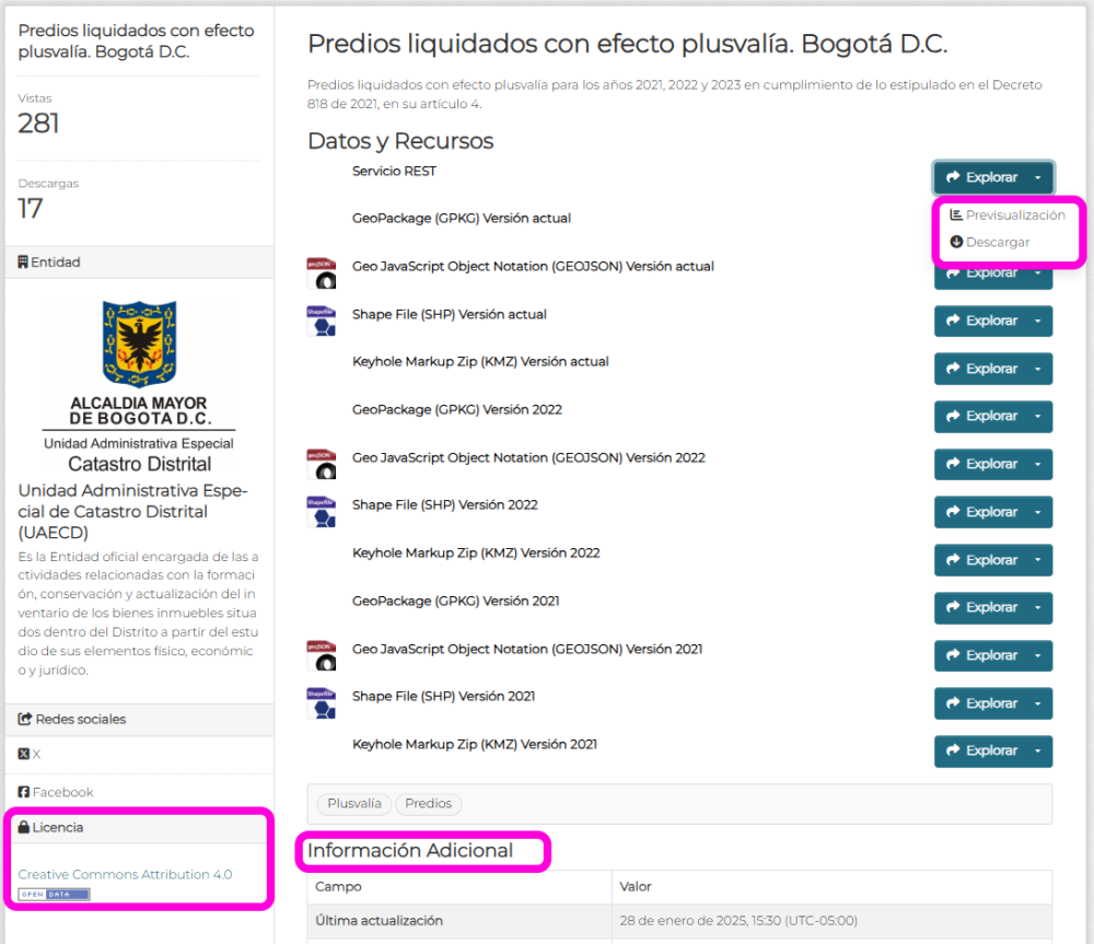 - Si deseas información adicional, puedes hacer clic sobre el nombre del dato y allí accederás a las opciones de previsualización, la licencia de uso y enlaces a otros recursos.