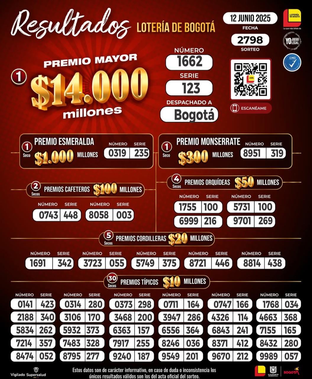 ¿Jugaste la Lotería de Bogotá? Te presentamos los resultados del último sorteo realizado este jueves 12 de junio de 2025. Conoce aquí los resultados del sorteo 2798 con un premio mayor de $ 14.000 millones y premios secos hasta de $ 1.000. ¡Aquí te presentamos los números ganadores, mucha suerte!