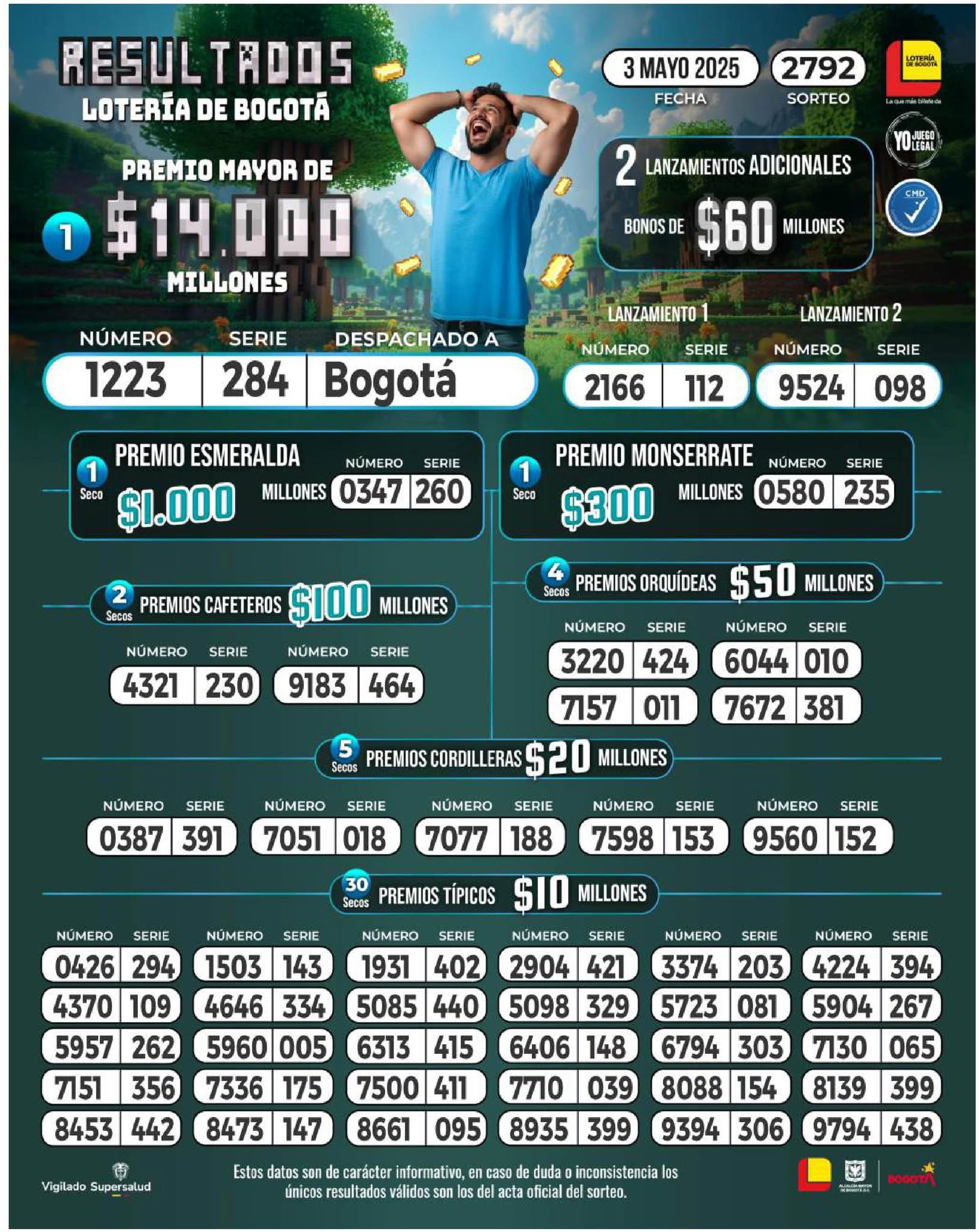 ¿Jugaste la Lotería de Bogotá? Te presentamos los resultados del último sorteo realizado este sábado 3 de mayo de 2025. Este jueves se jugó el sorteo 2792 con un premio mayor de $ 14.000 millones ¡Conoce aquí el número ganador y mucha suerte!