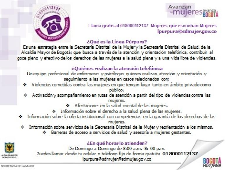 La 'Línea Púrpura Distrital' es una estrategia de la Secretaría Distrital de la Mujer y la Secretaría Distrital de Salud, de la Alcaldía Mayor de Bogotá, creada con el objetivo de prevenir el feminicidio, el daño emocional y las afectaciones en salud de las mujeres, por medio de una línea telefónica de orientación y atención psicosocial, que a través de su equipo profesional de enfermeras y psicólogas, atiende casos relacionados con la siguiente temática: