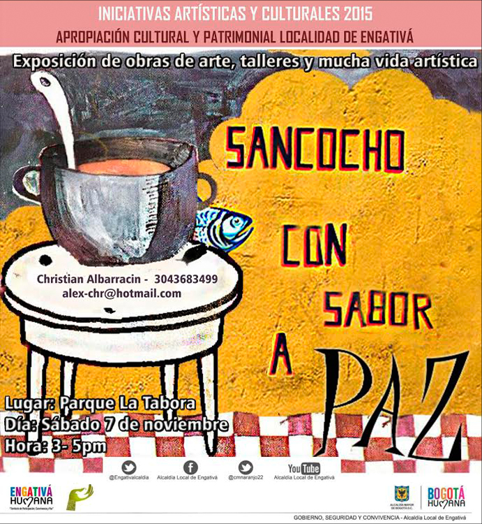 Para mayores informes comuníquese con Christian Albarracin al número de celular 304 368 34 99 o a través del correo electrónico alex-chr@hotmail.comLa jornada gratuita que se reconocerá como 'Sancocho con Sabor a Paz', irá de 3:00 p.m. a 5:00 p.m. y tendrá como objetivo la apropiación cultural y patrimonial de la localidad de Engativá.
