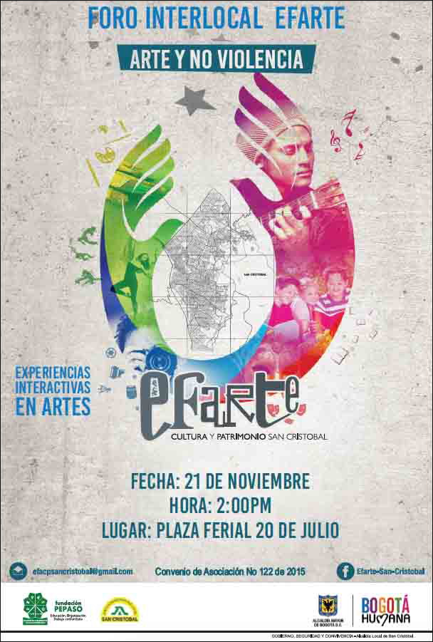 Hoy sábado 21 de noviembre de 2015, a las 2: 00 p.m., en el recinto ferial Plaza Feria 20 de julio (diagonal 30 A sur No. 5-91), tendrá lugar el Foro Interlocal de la Escuela de Formación en Arte, Cultura y Patrimonio de la localidad de San Cristóbal (EFARTE), el cual busca visibilizar las prácticas artísticas y la importancia de compartir experiencias y saberes interlocales y al cual la administración local invita a la comunidad a participar de manera gratuita.