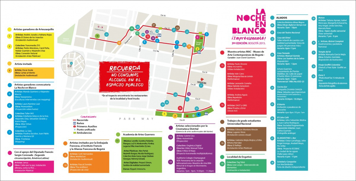 Este sábado 28 de noviembre de 2015, de 7:00 p.m. a 1:00 a.m. del domingo, la localidad de Teusaquillo nuevamente se ilumina con la tercera edición de 'La Noche en Blanco', donde todos los habitantes de las localidades de Bogotá, podrán disfrutar del arte contemporáneo en un recorrido único por las calles del territorio local.
