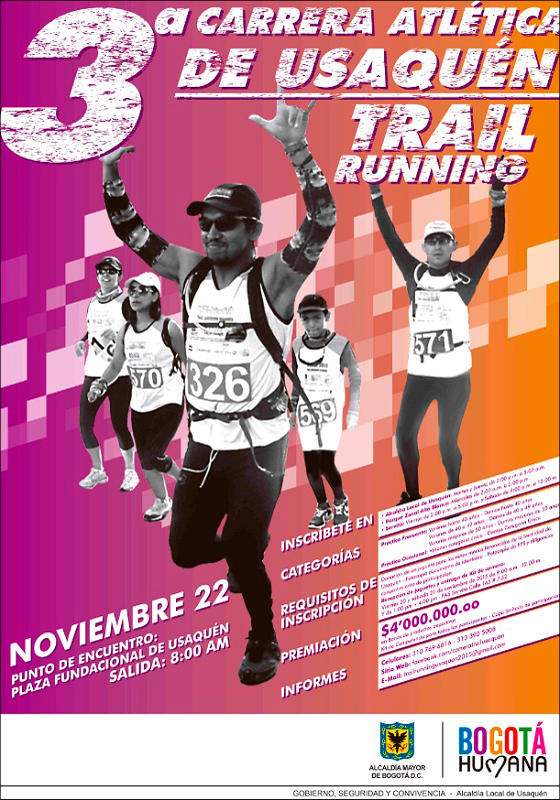 Hoy domingo 22 de noviembre de 2015, a las 8:00 a.m., se llevará a cabo la III carrera atlética de Usaquén ‘Trail Running’ en la que más de mil atletas partirán de la Plaza Fundacional (carrera 6 A con calle 119), subirán hasta el sector de La Aguadora, se internarán por los cerros orientales de la localidad y retornarán al punto de salida.