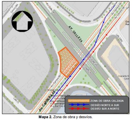 ● Los usuarios que transitan en sentido norte – sur por la av. Carrera 68, deberán continuar hacia el Sur por el carril que quedará en contraflujo (Mapa 2 color azul).