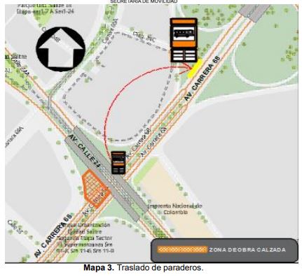 ● Los paraderos 065A06 - 065B06 - 065C06 - 065D06: se unificarán y trasladarán al paradero provisional 115A05 ubicado sobre la Av. Carrera 68 a 200 metros al Norte de la Av. Carrera 24 (Mapa 3).