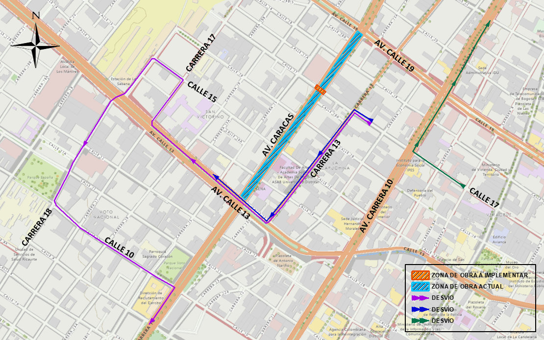 - Los usuarios que transiten en sentido oriente-occidente por la Calle 17 y desean tomar la av. Caracas al sur, deberán continuar por la Carrera 13 al sur – av. Calle 13 al occidente - Carrera 17 al norte – Calle 15 al occidente – Carrera 18 al norte - Calle 10 al oriente por donde se empalman nuevamente a su recorrido habitual (ver Mapa 2 – color morado).