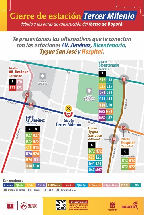 A partir del próximo 12 de abril de 2025, la estación Tercer Milenio deja de operar para dar paso al avance de la construcción de la Línea 1 del Metro de Bogotá, por lo que el Sistema ofrece y presenta distintas alternativas de desplazamiento para los usuarios en las estaciones y paraderos aledaños a la zona.