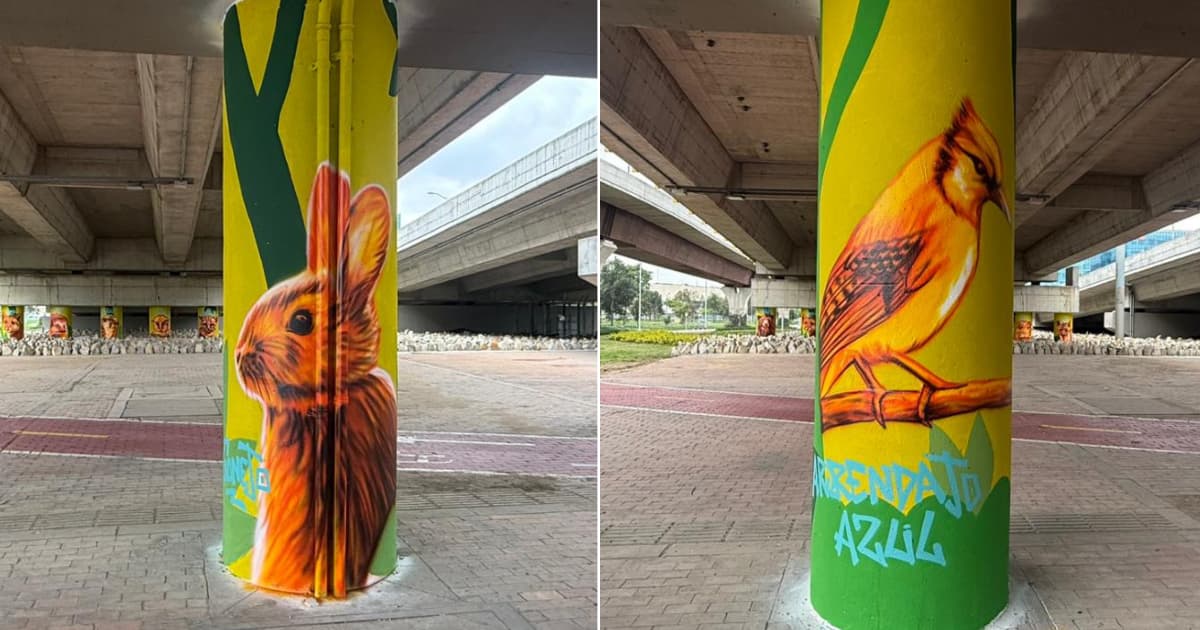 Desde el Instituto de Desarrollo Urbano (IDU) realizamos una nueva intervención artística en Bogotá en el bajopuente de la avenida 68 con avenida 26, donde se intervinieron 54 columnas con murales inspirados en la fauna y flora de Cundinamarca. En esta obra hay aves, mamíferos y ranas como símbolo de la riqueza natural del territorio y hace parte del Grupo 5 de la avenida 68. En total, se representaron 45 especies, creando un recorrido visual dinámico y lleno de color que promueve la apropiación del espacio público.