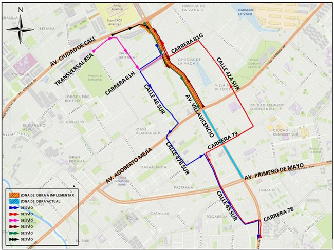 - Las personas que transitan en sentido oriente – occidente por la avenida Villavicencio, podrán tomar la carrera 78 al sur, calle 45 sur al occidente, carrera 79 al norte, calle 42A sur/diagonal 42A sur al occidente y carrera 81G al sur por donde se empalmarán con su recorrido habitual (Mapa 1 - color rojo).