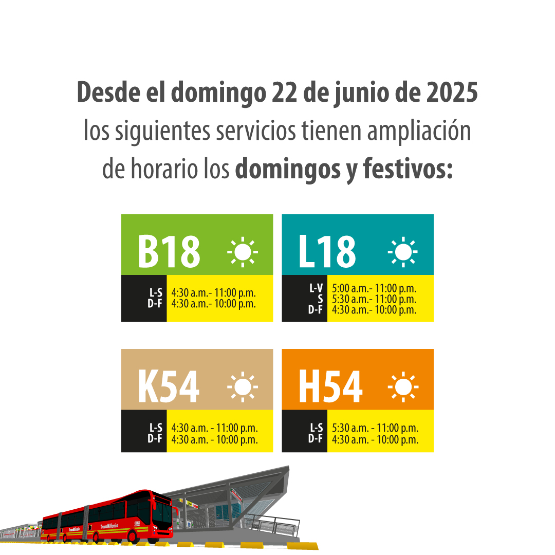 Aquí sí pasa, se adelantan acciones en Bogotá, mi Ciudad, mi Casa para mejorar la movilidad. TransMilenio informó que a partir del 22 de junio las rutas troncales B18-L18 y H54- K54, ampliaron su horario los días domingos y festivos.