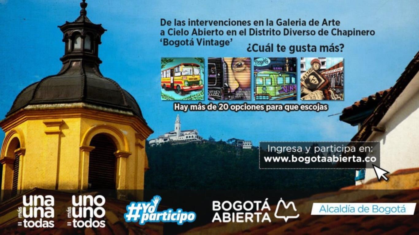 La Alcaldía Mayor a través del IDPAC mediante el modelo de Participación Uno más Uno = Todos, Una más Una = Todas, realizó el pasado 17, 18 y 19 de agosto una intervención artística y comunitaria en la localidad de Chapinero, denominada “Distrito Diverso de Chapinero, Bogotá Vintage”. Un grupo de talentosos artistas de Bogotá participó de este proceso de embellecimiento, apropiación y participación de la comunidad. En total se realizaron 23 espectaculares obras.