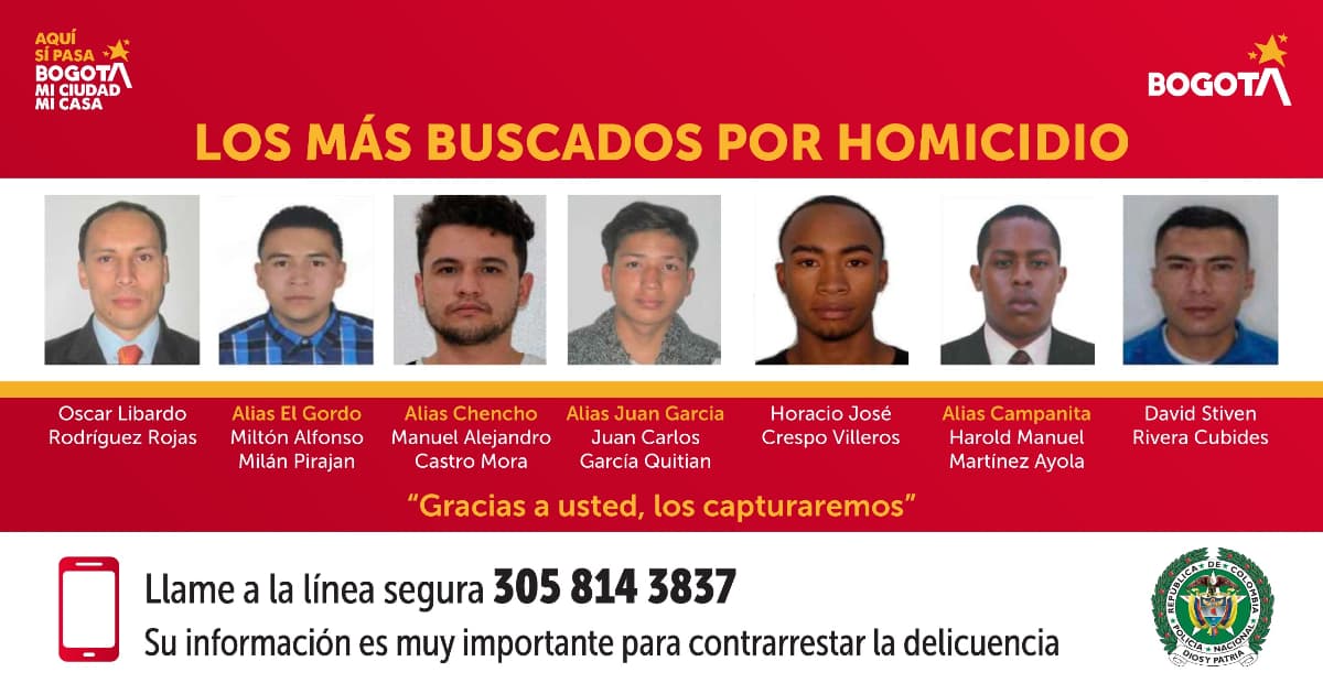 Las personas incluidas en este cartel son: Horacio José Crespo Villeros, investigado por un homicidio cometido con arma de fuego en vía pública en la localidad de Tunjuelito. De igual manera, David Stiven Rivera Cubides, señalado por su presunta participación en un hecho con arma cortopunzante ocurrido en medio de una riña en Ciudad Bolívar. Otro es Juan Carlos García Quitián estaría vinculado en un homicidio con arma de fuego registrado en esta misma localidad, al parecer en medio de una riña. Por otra parte, Oscar Libardo Rodríguez Rojas es requerido por su presunta responsabilidad en el feminicidio de su esposa ocurrido en la localidad de Barrios Unidos.
