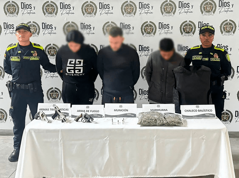 Durante el operativo realizado, se ejecutaron cuatro órdenes de allanamiento y registro en las localidades de Puente Aranda, Rafael Uribe y San Cristóbal logrando la captura en flagrancia de dos hombres y una mujer, asimismo se les incautó un chaleco balístico, tres armas de fuego con cuatro cartuchos calibré 38, 842 gramos de marihuana y 45 gramos de base de coca.
