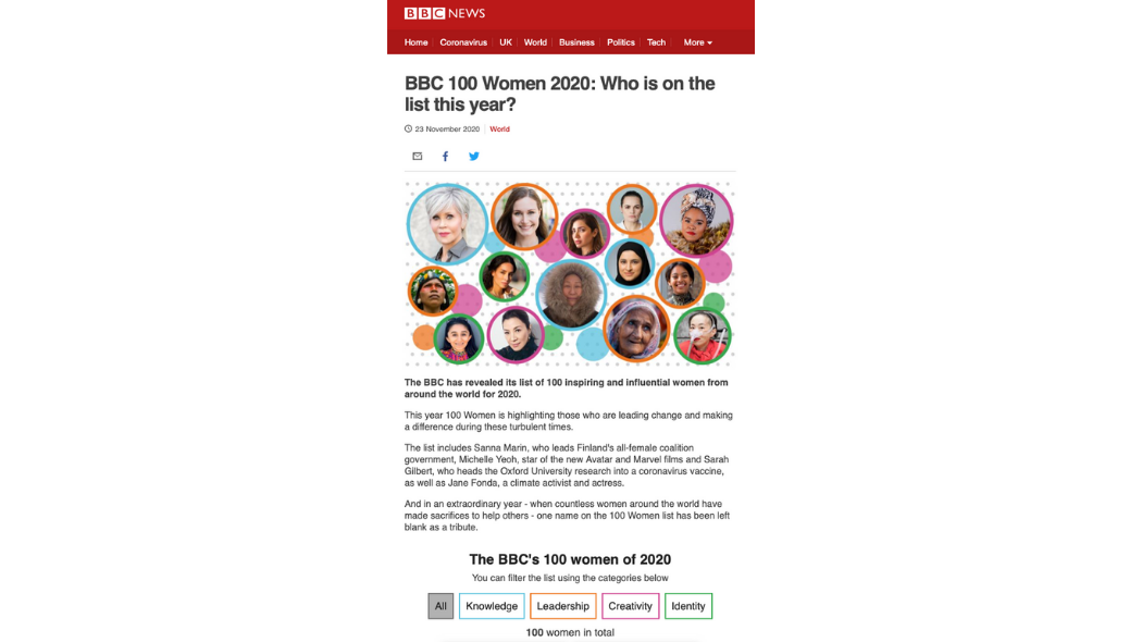 The BBC 100 Women list is an annual ranking of the 100 most influential and inspiring women from around the world created by BBC World.